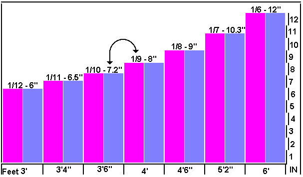 To use the chart, simply find the size of the figure you need on the slope and see what figures are available that are that size on the chart below it. A six inch figure to use as a halfling or an orc? Look it up in the 1/12 area and so on. Need a nine inch slender to make that teen boy mentioned earlier? Find it on the 1/8 chart and then go hunting.