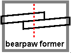 The first pair of snowshoes I ever did, I used two 2.5 inch diameter salt shaker lids layed side by side as the former to hold the steamed wood. They came out totally perfectly oval which wasn't very close to the bearpaw pattern I was shooting for. I then started looking at making formers just for snowshoes and it got a LOT easier. I cut my formers out of 1/4 inch modeling liteply wood and then glued those down to another piece of liteply with wooden pegs to hold the steamed-wood ends. I can now make one pair of each type of shoes all at one time and lace three to five pairs of them in an evening if the wife lets me.